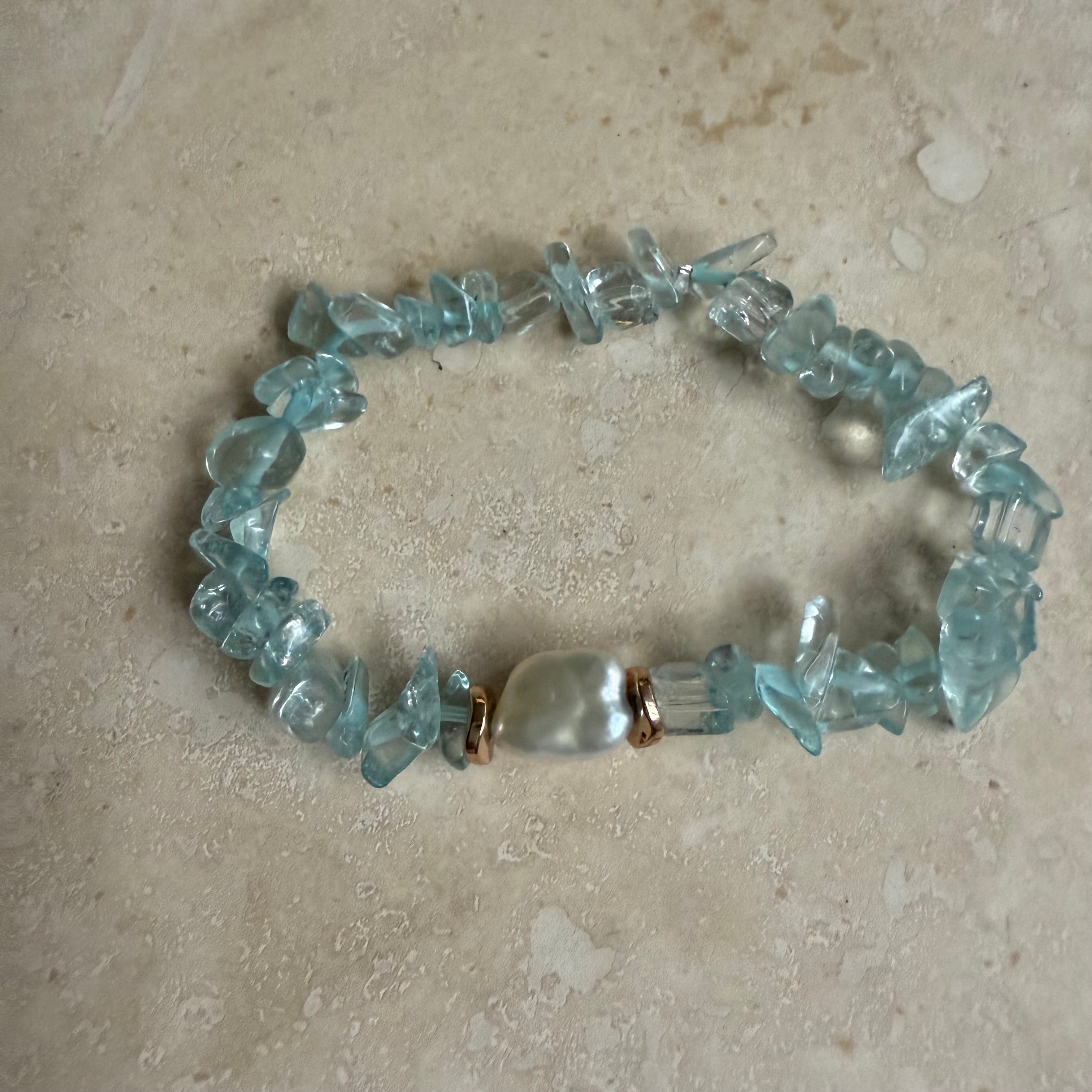 The Oasis Bracelets are crafted from colourful, organic stone chips paired with luminous sea pearls, separated by delicate gold spacer beads. Each bracelet is strung on heavy-duty elastic for a comfortable, durable fit.