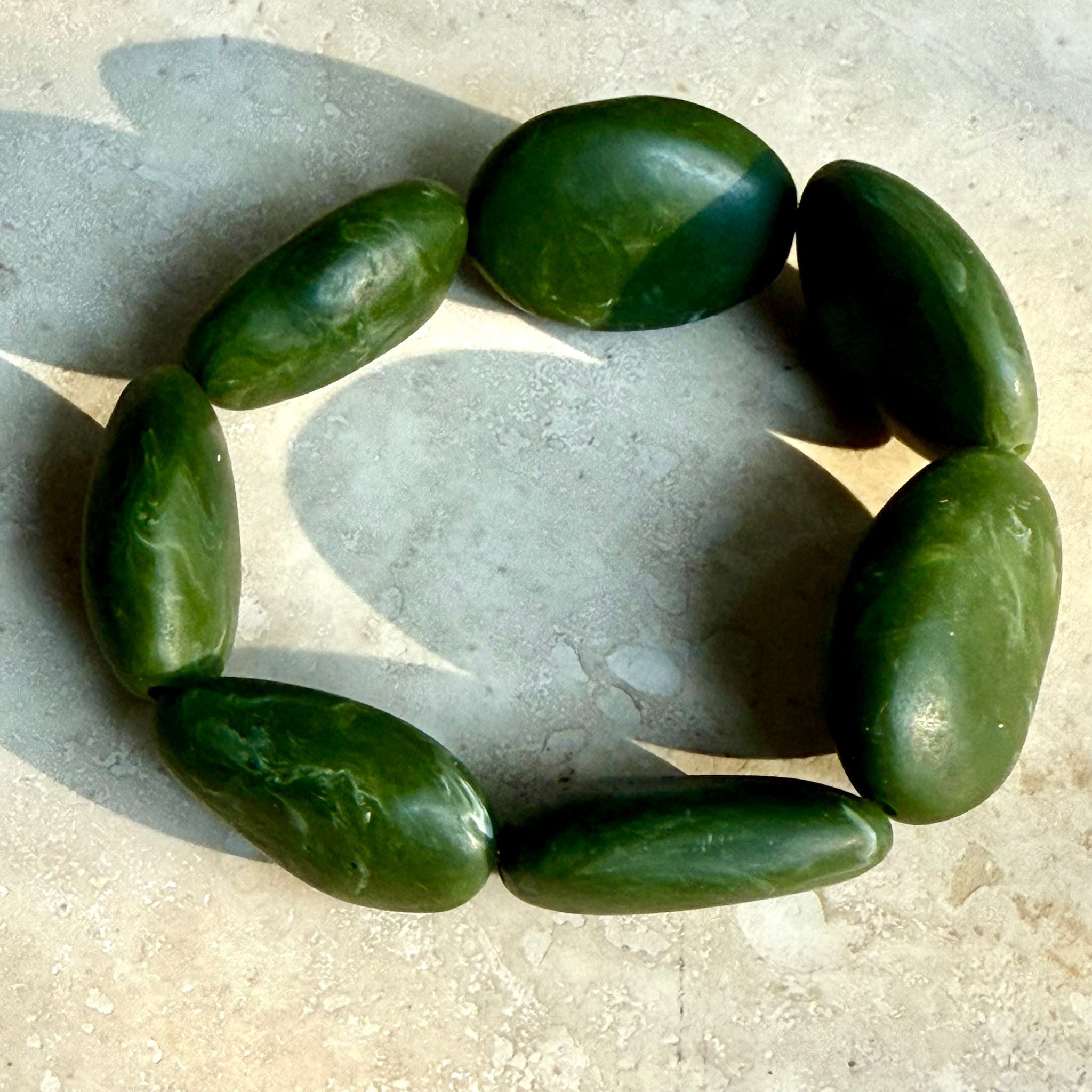 The Sirena bracelets are crafted from cast beach pebbles in coloured resin—available in Olive, Cream, Marble, Blue, Aqua, and White. Strung on heavy-duty elastic for a comfortable and durable fit. Light and easily stackable, the organic form not only looks great, but this smooth bracelet is a joy to wear.